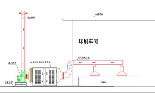二、印刷废气光催化净化处理工艺:印刷废气—— 废气收集罩——主风管——光催化除臭设备——风机——达标排放